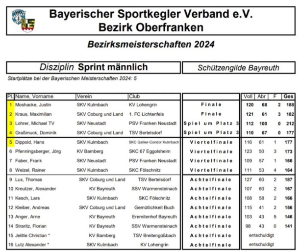 Gleich drei Kegler vertreten den Keglerkreis West bei den Sprintmeisterschaften bei der Bayrischen. Maximilian Kraus wurde zweiter bei den Bezirksmeisterschaften, Michael Lohrer dritter und sensationell vierter wurde Dominik Graßmuck . Bereits im Achtelfinale schieden Andreas Kleiber aus und Lars Kesch Unglücklich im sudden Viktory .
